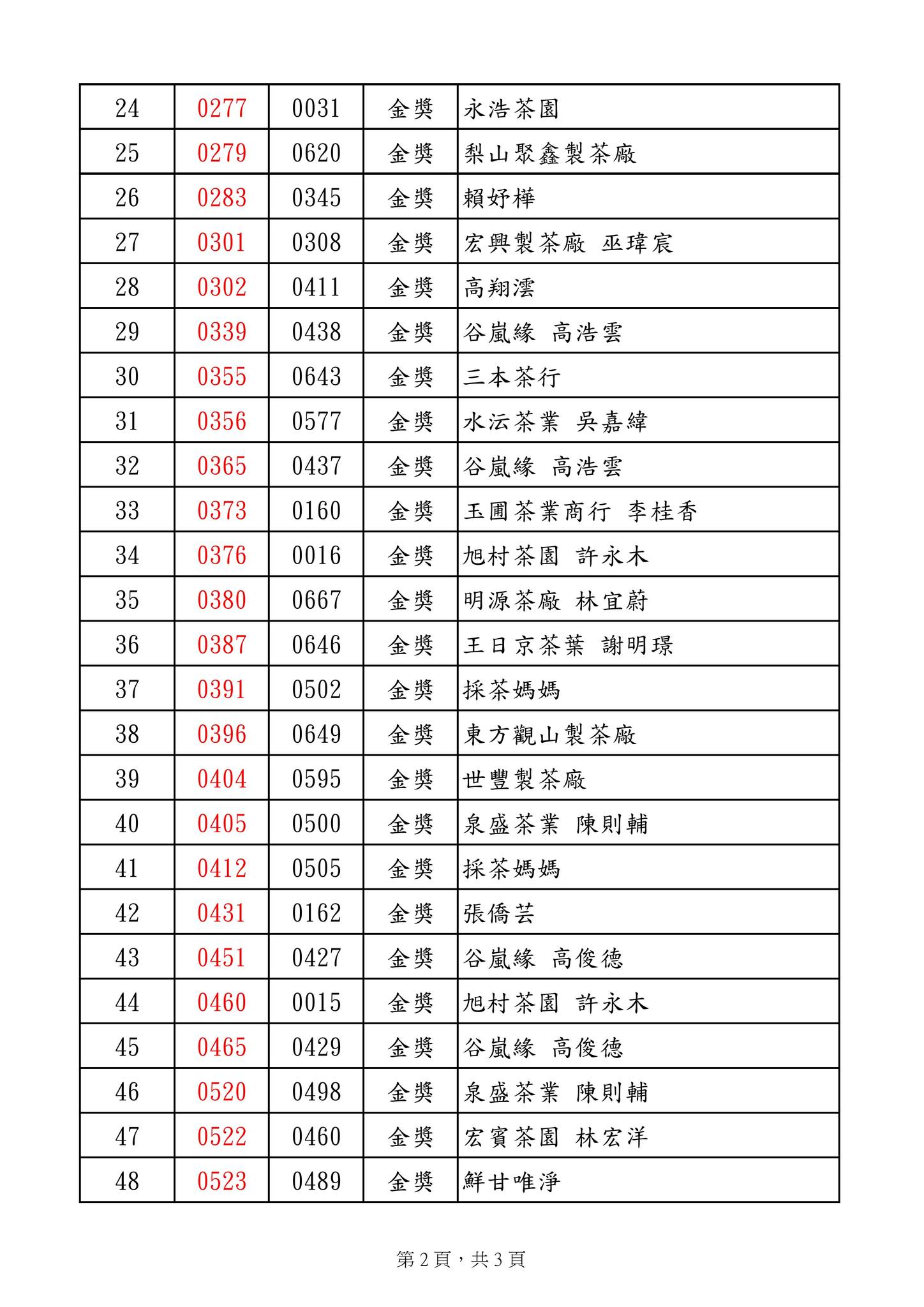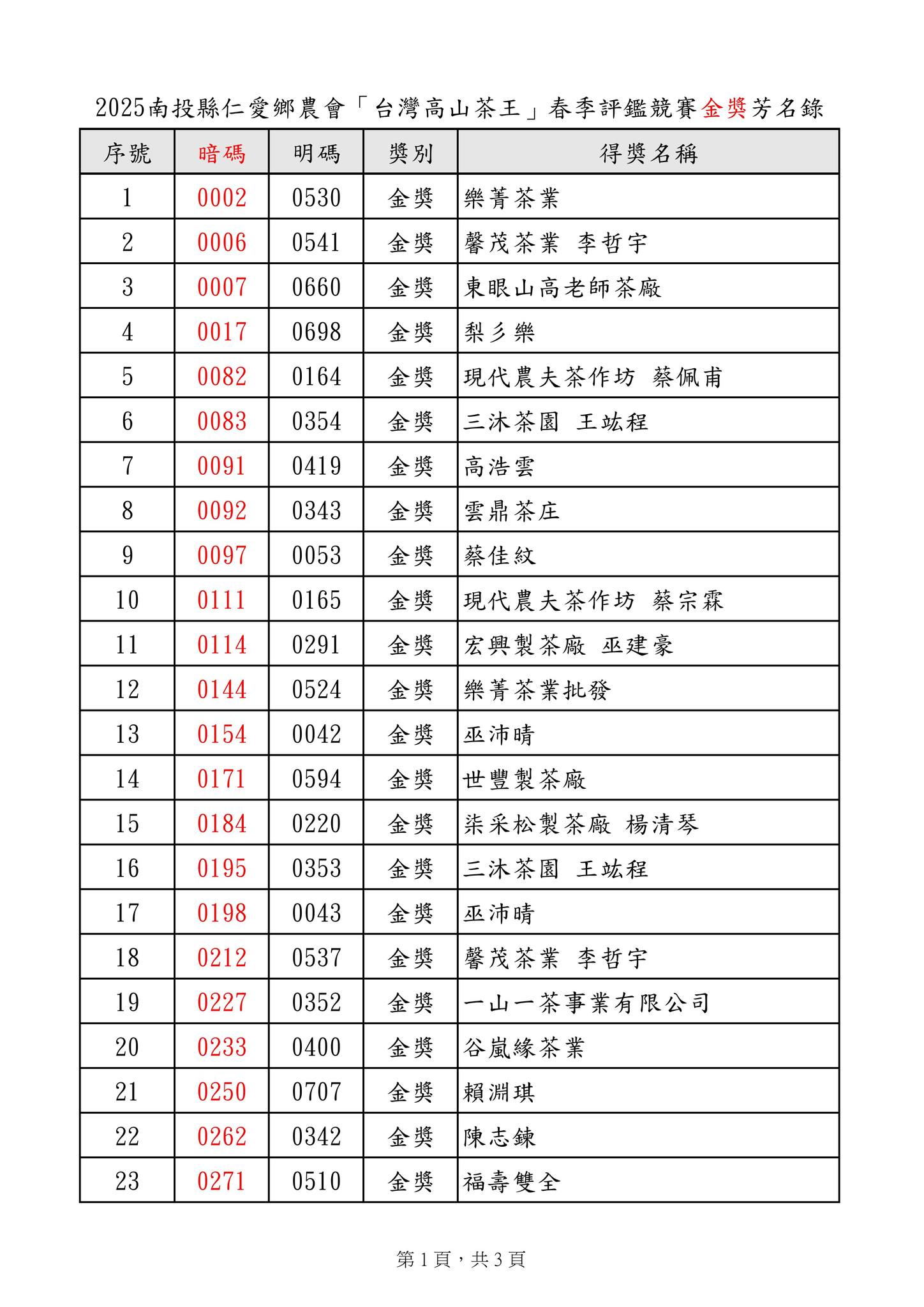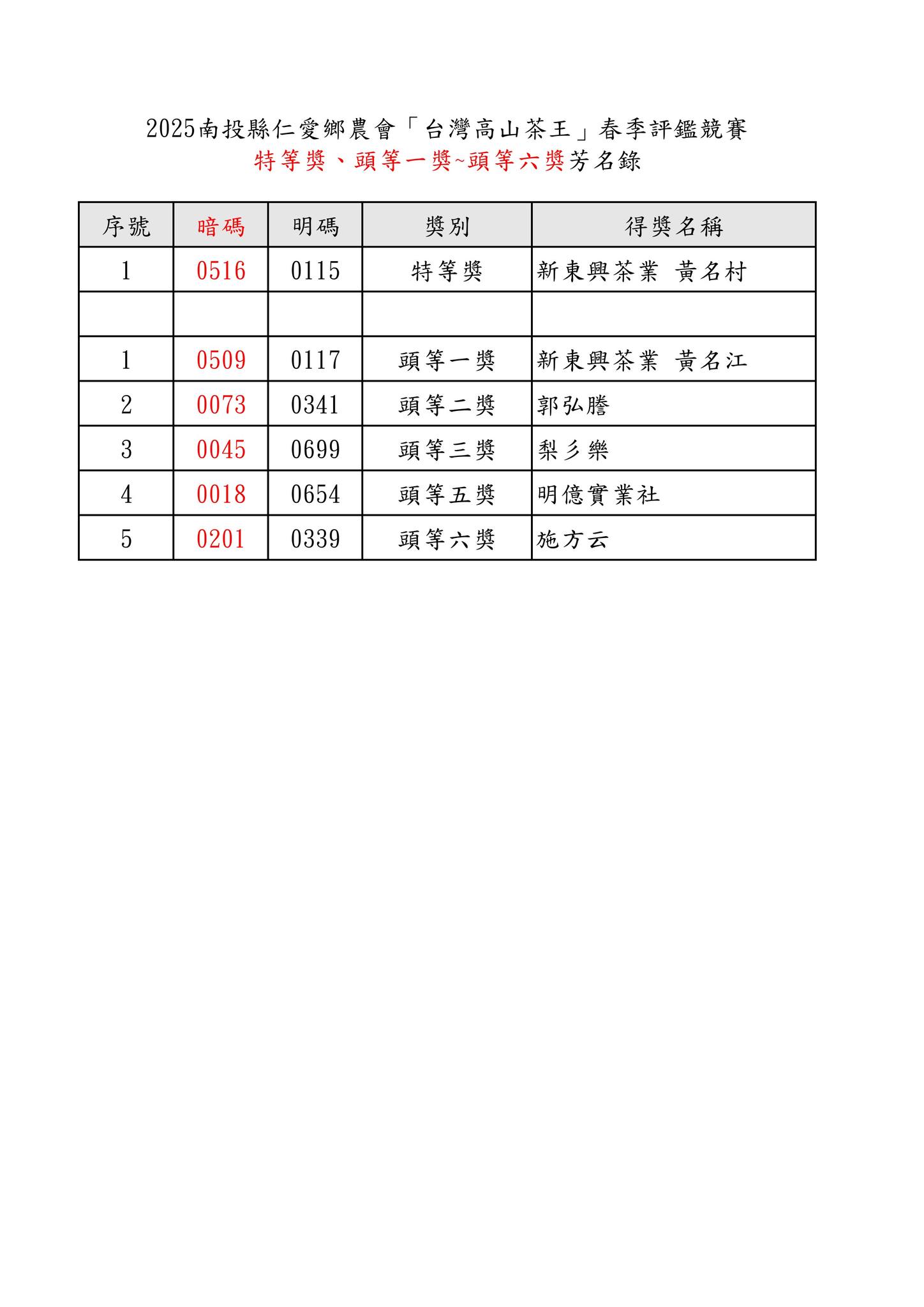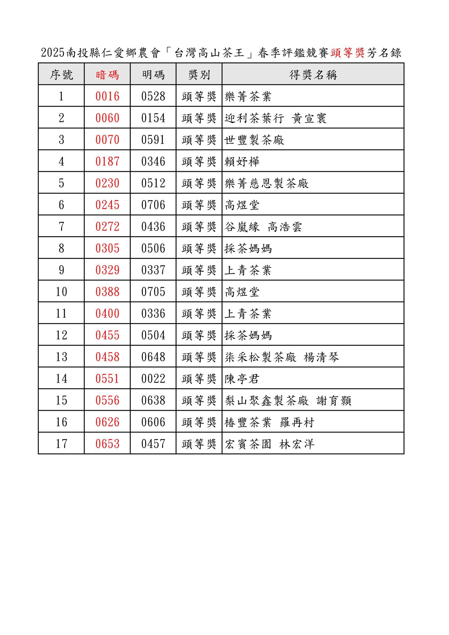 「#2025台灣高山茶王春季評鑑競賽」得獎芳名錄